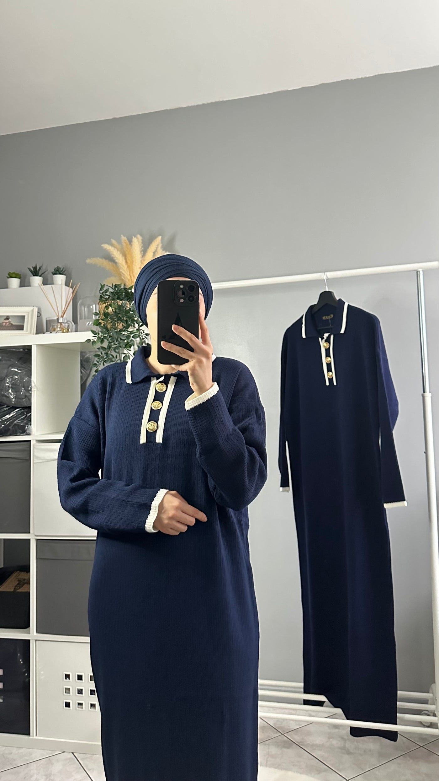Robe longue bleu marine qui réunit l'élégance avec les boutons dorés